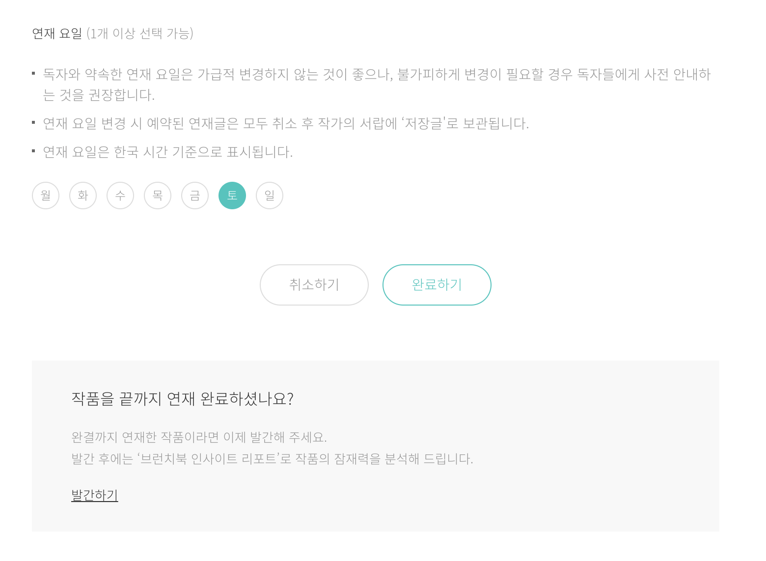 브런치북을 3개씩 연재하려고 하다보니 무리가 있어서 연재 종료를 하려고 하는데..정말 브런치 ㅜㅜ 이럴 거야? 너무너무 불친절해서 연재 종료 방법이 나와있지를 않다... 방법 알아보니 이렇다 1. 10회 이상 연재해야 연재 종료가 가능하다 일부러 회차 채우려고 무의미한 글을 쓰는 분들도 계셨음.. 2. 내 브런치 > 연재 클릭하고 내가 연재 종료를 원하는 브런치북 열기 3. 브런치북 첫 페이지 우측 상단에 있는 설정, 관리 버튼 누르고 > 브런치북 편집 클릭 4. 편집 페이지에서 하단으로 쭉 내려가면 10회 이상 연재한 작품에 대해서만 [발간하기] 버튼이 나온다발간하시면 연재 종료가 된다고 함. 나는 9회차까지만 쓴 글에 대해서 계속 연재 종료를 시도했어서 발간하기 버튼이 없었는데 12회차까지 쓴 브런..